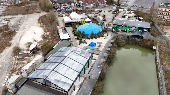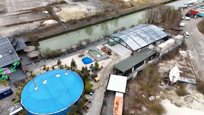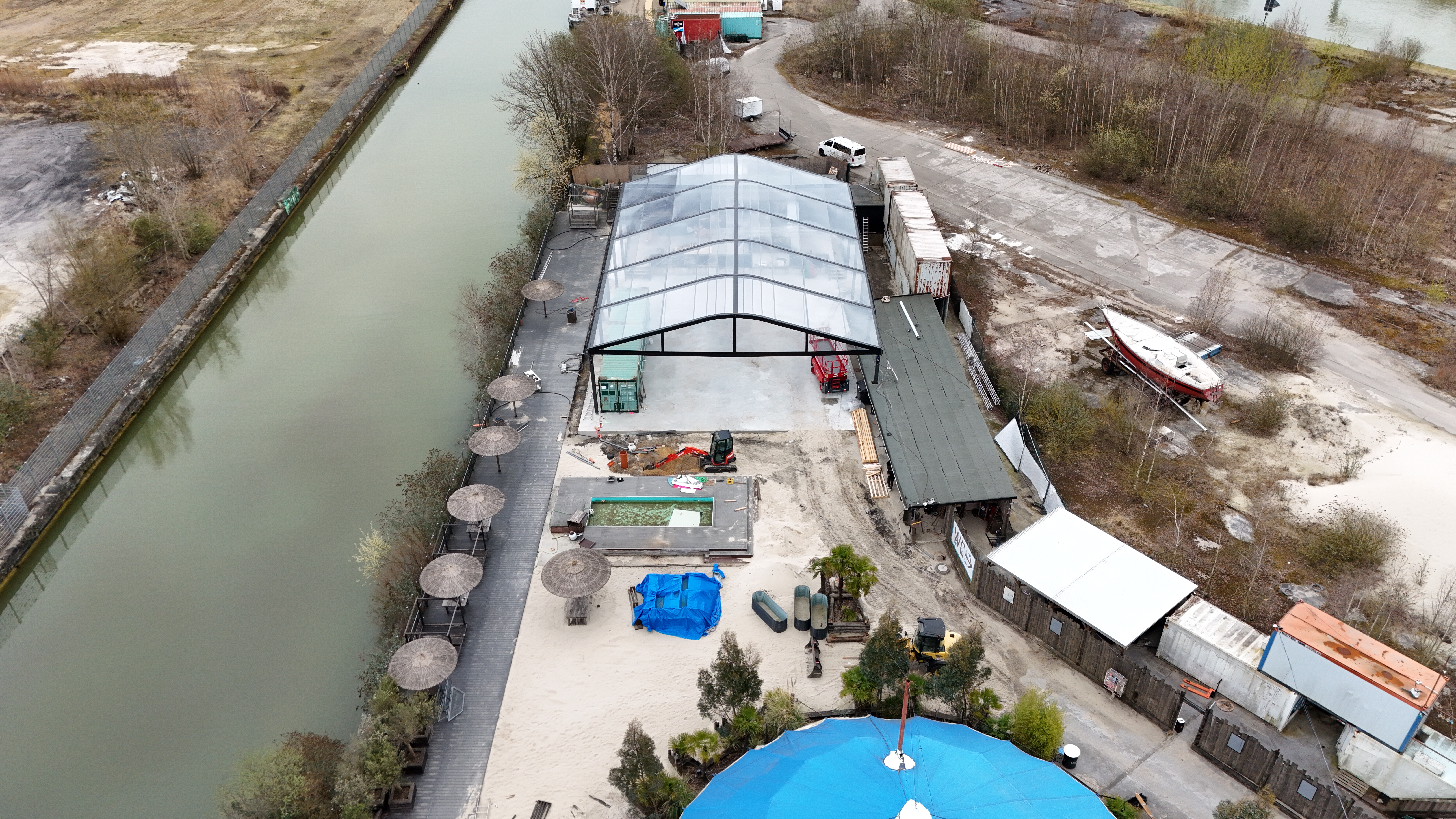 This canal-side location needed a venue that gave full access to the surrounding area so an open-sided canopy was chosen. To maximise the feeling of being outside, a clear Polyglas roof and gable ends were used above a dance floor, DJ booth, VIP area and bar.