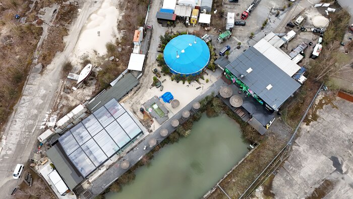 The canopy is based on our marquee event structure with anthracite powder-coated arched aluminium frame and suspended gables. Taking out all walls except the back wall behind the stage gives fabulous access for party-goers to the surrounding location.