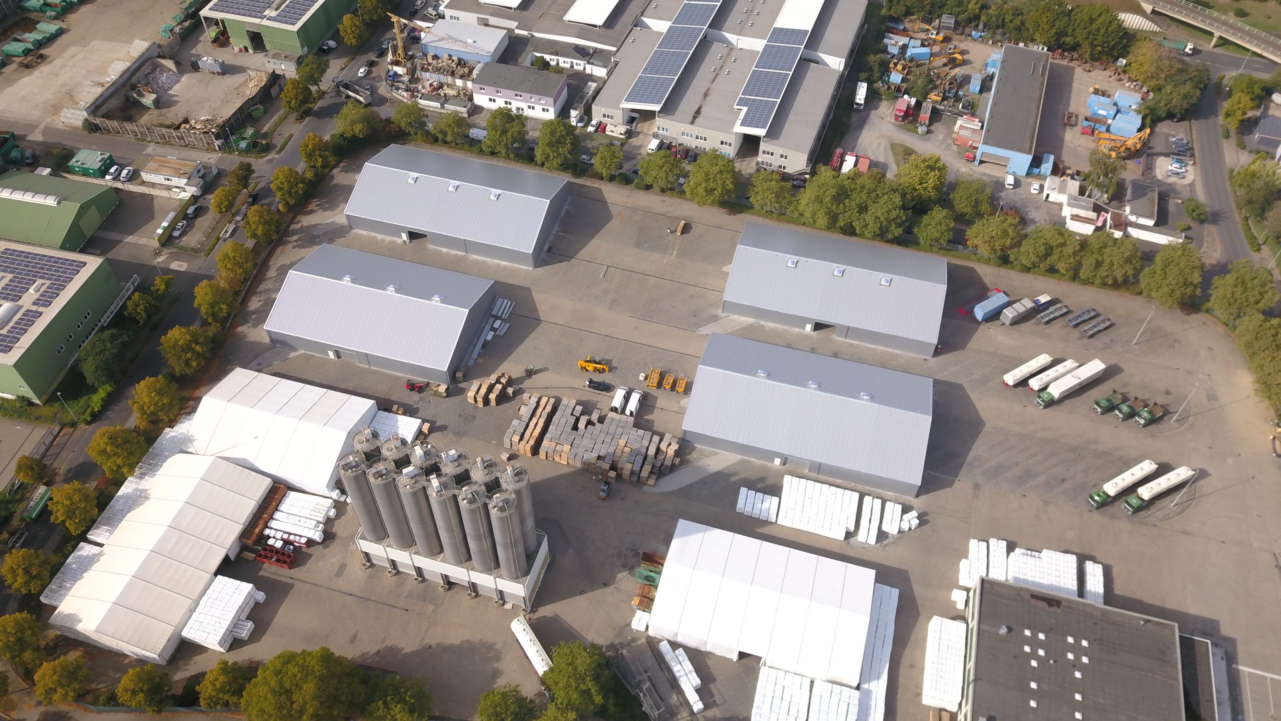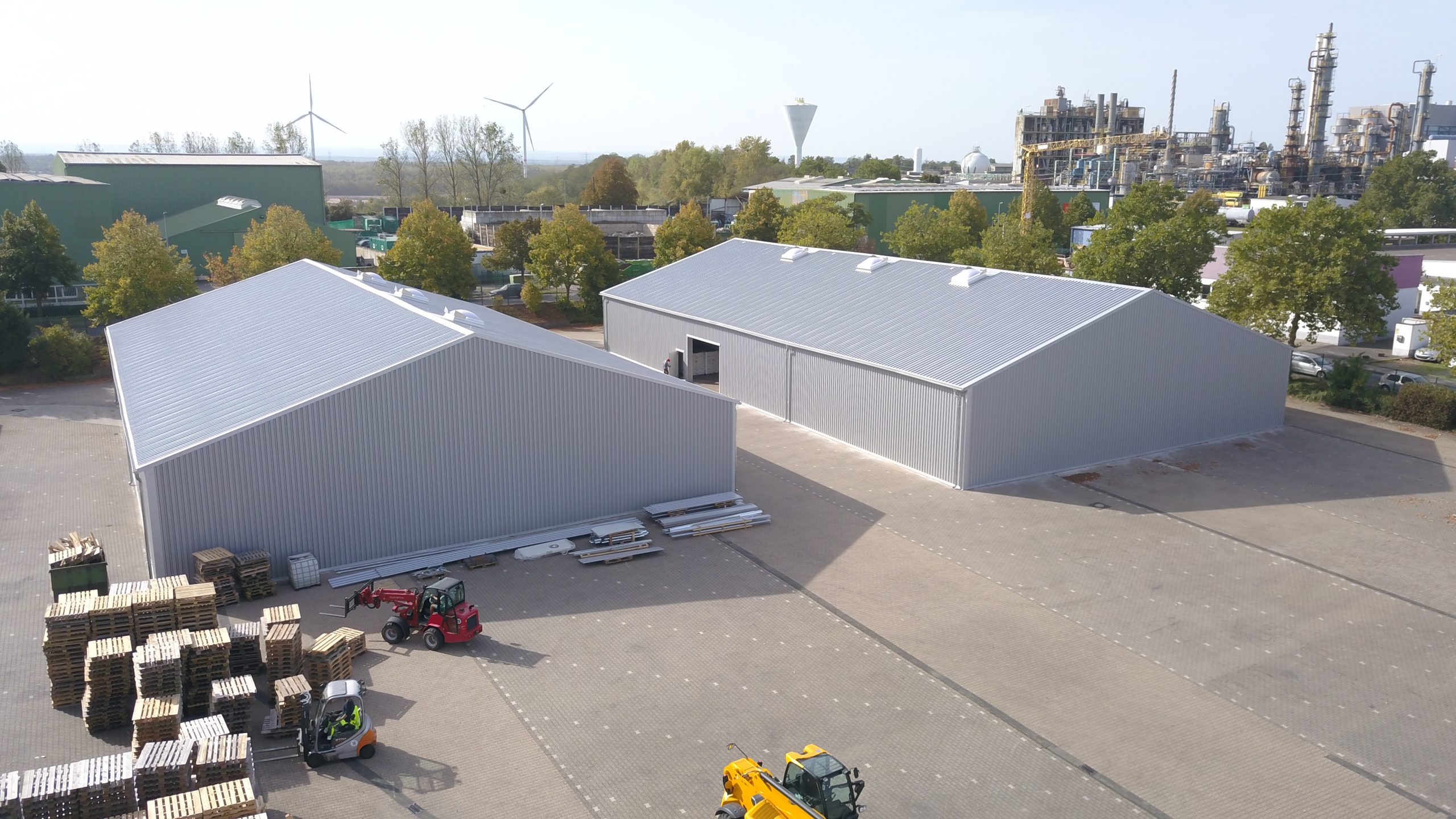 The storage buildings were needed at very short notice and there was no time for foundation work, so they had to be adapted to a very uneven surface. In some places, the length of the buildings differ in height by up to 1.6m and approximately 1m difference in the ground height in the building widths had to be taken into account.
