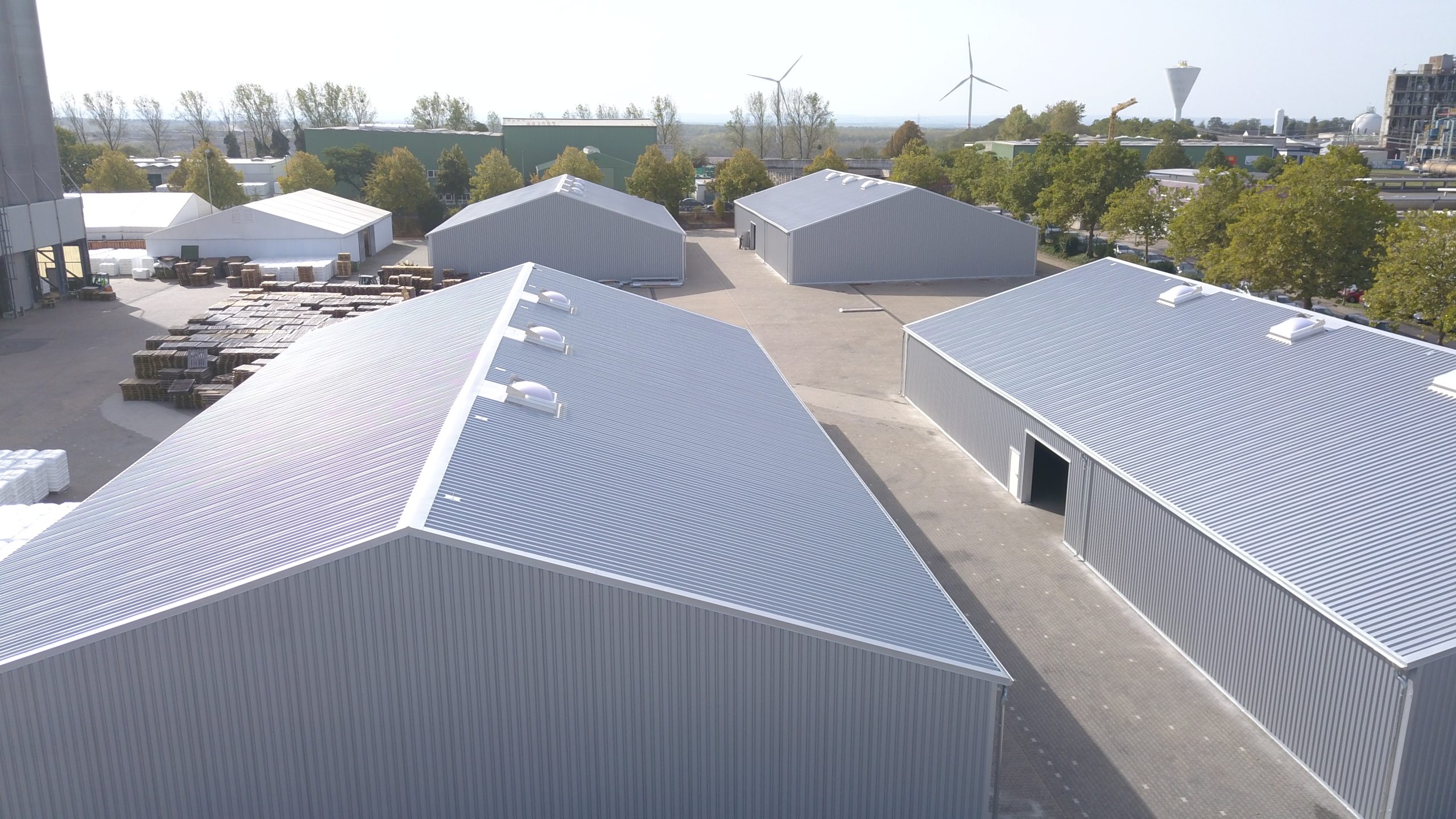 The buildings are constructed with corrugated sheet walls with an anti-condensation coating. Each wall panel is sealed at the floor with a milled edge and bitumen sealing. This helps protect the goods stored on the paved surface from moisture.