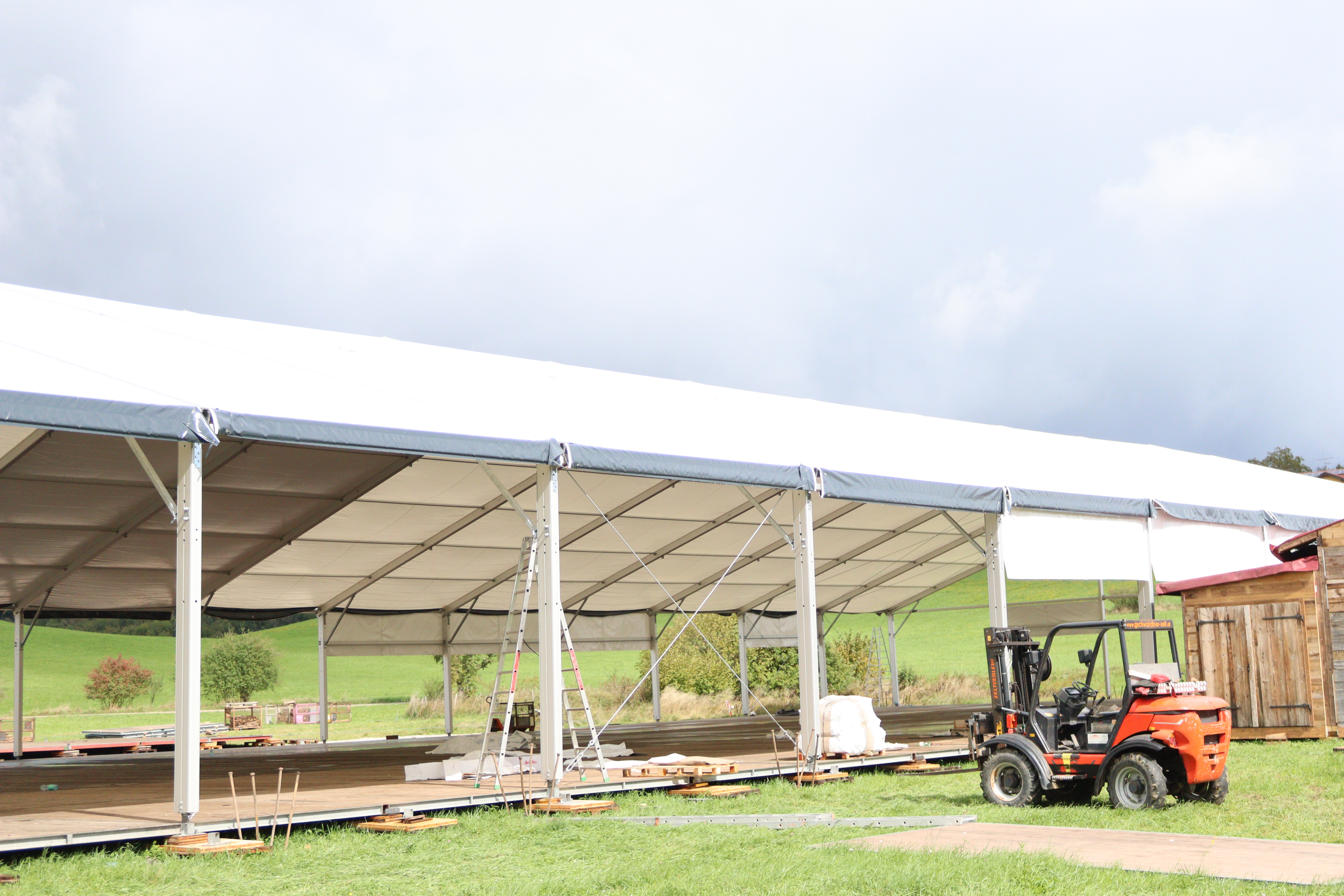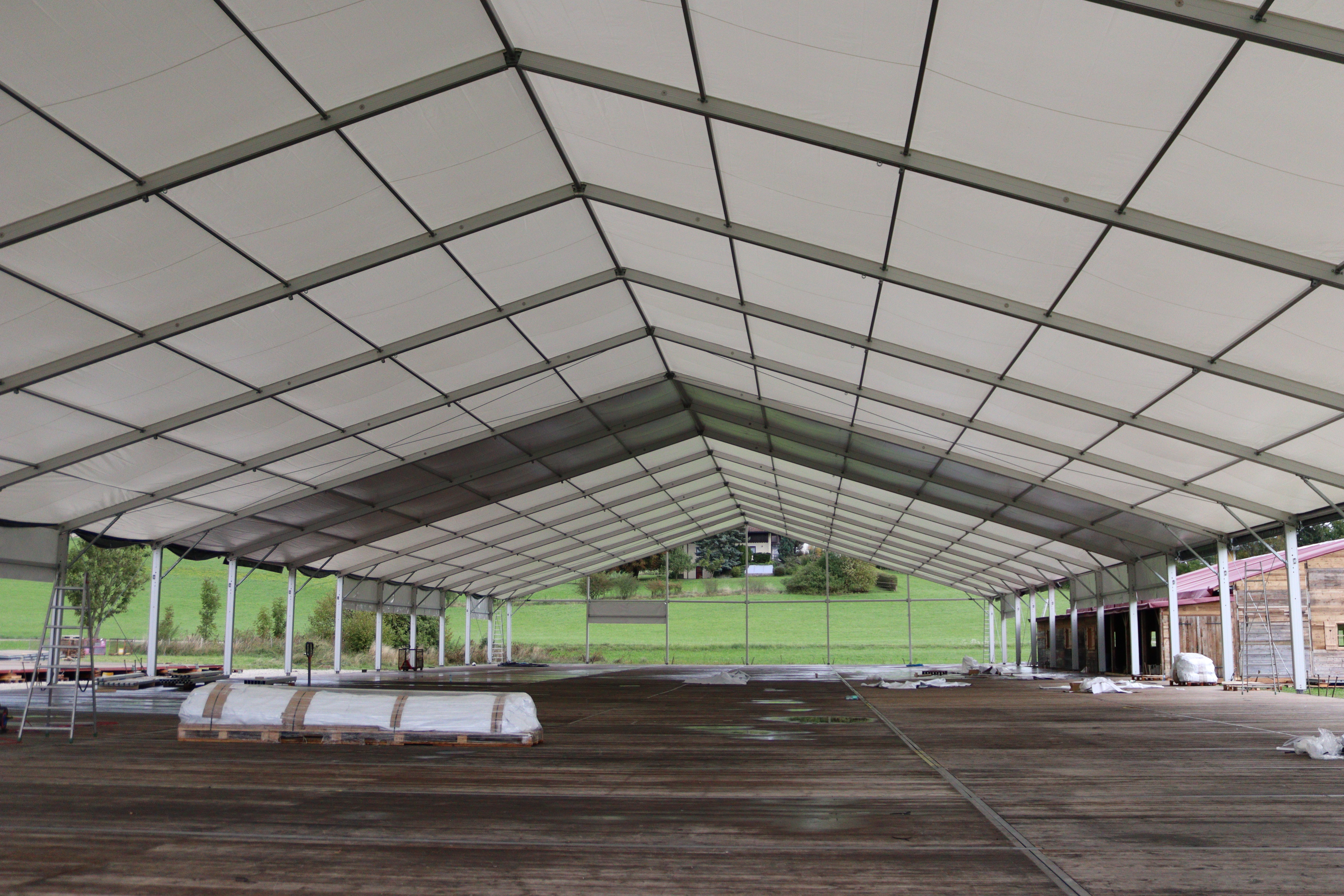 This huge 30 x 90m marquee with 4m high walls provides 2,700 m² of floorspace, yet it was erected on grass in a field in Wels, Austria.