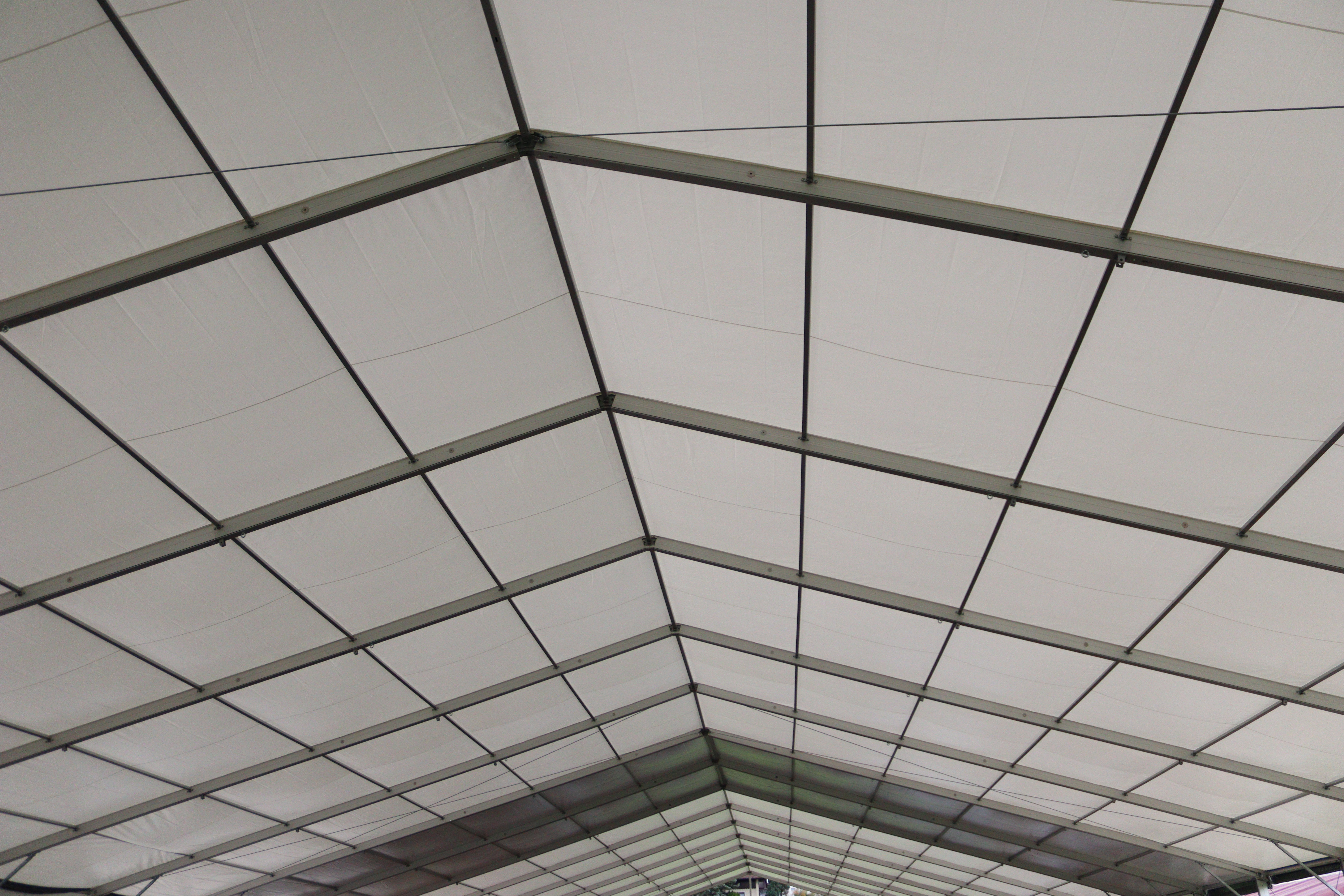 Industrial strength, fire resistant (DIN 4102/B1, M2) PVC sheets in white are opaque for the walls while translucent panels are used for the roof to let light in. The PVC walls can be opened in various configurations and come with awnings above each 5m section. The marquee is finished with white PVC gable ends with additional ventilation.