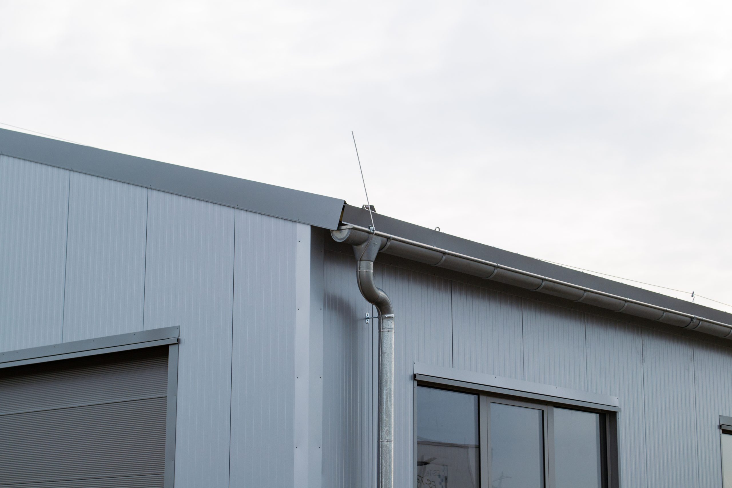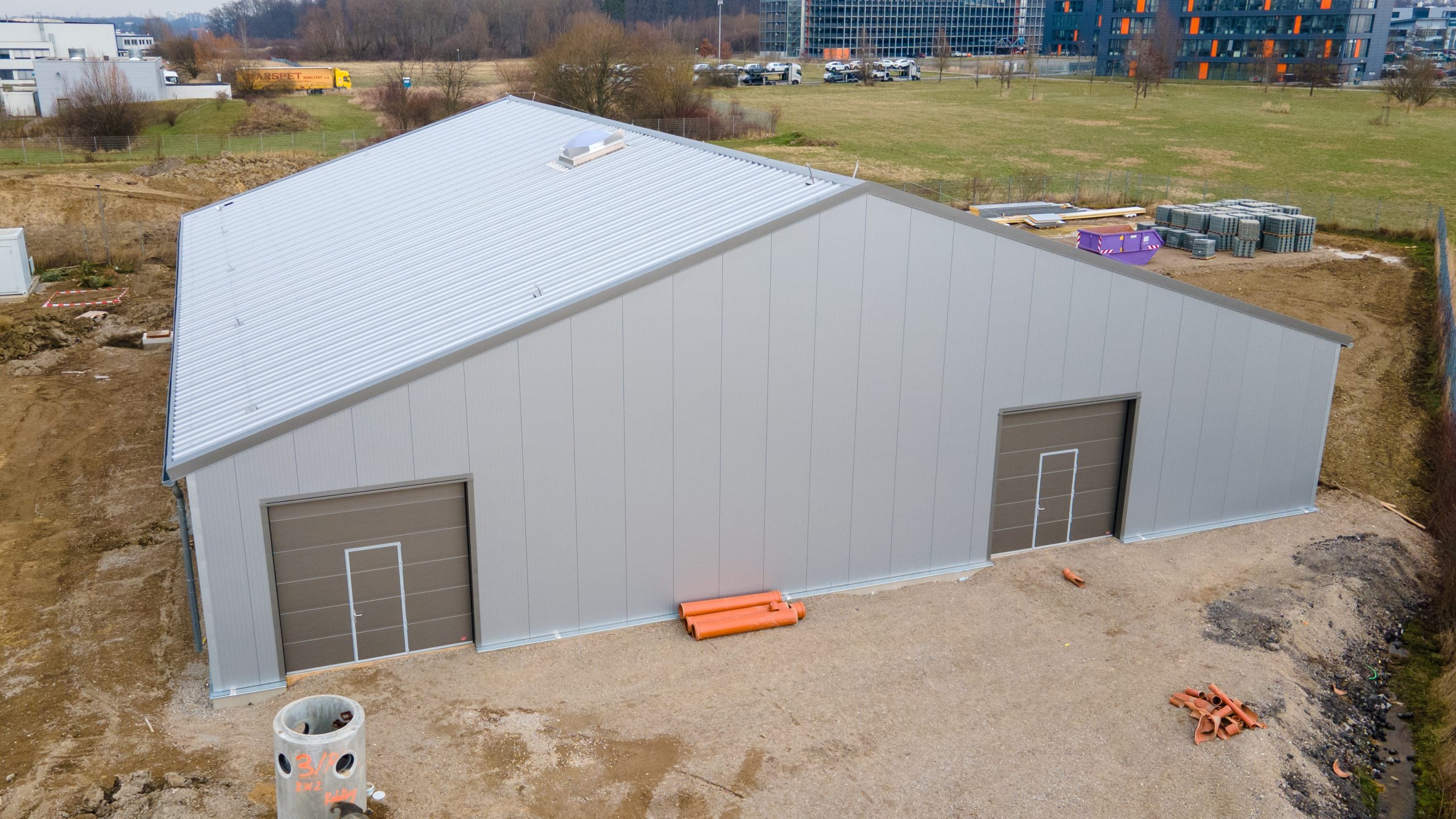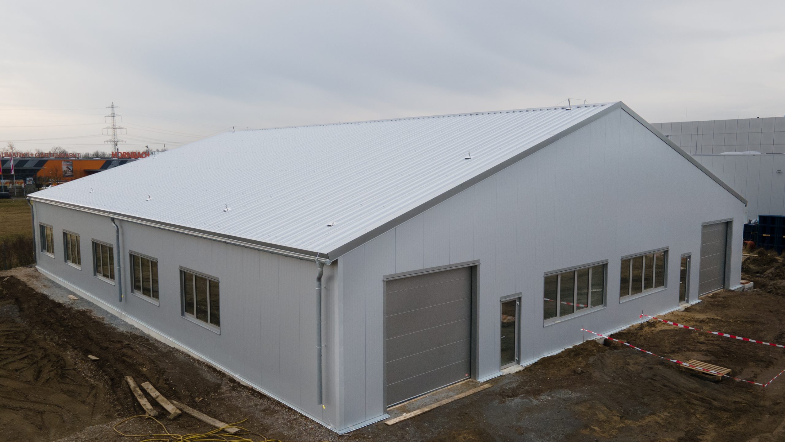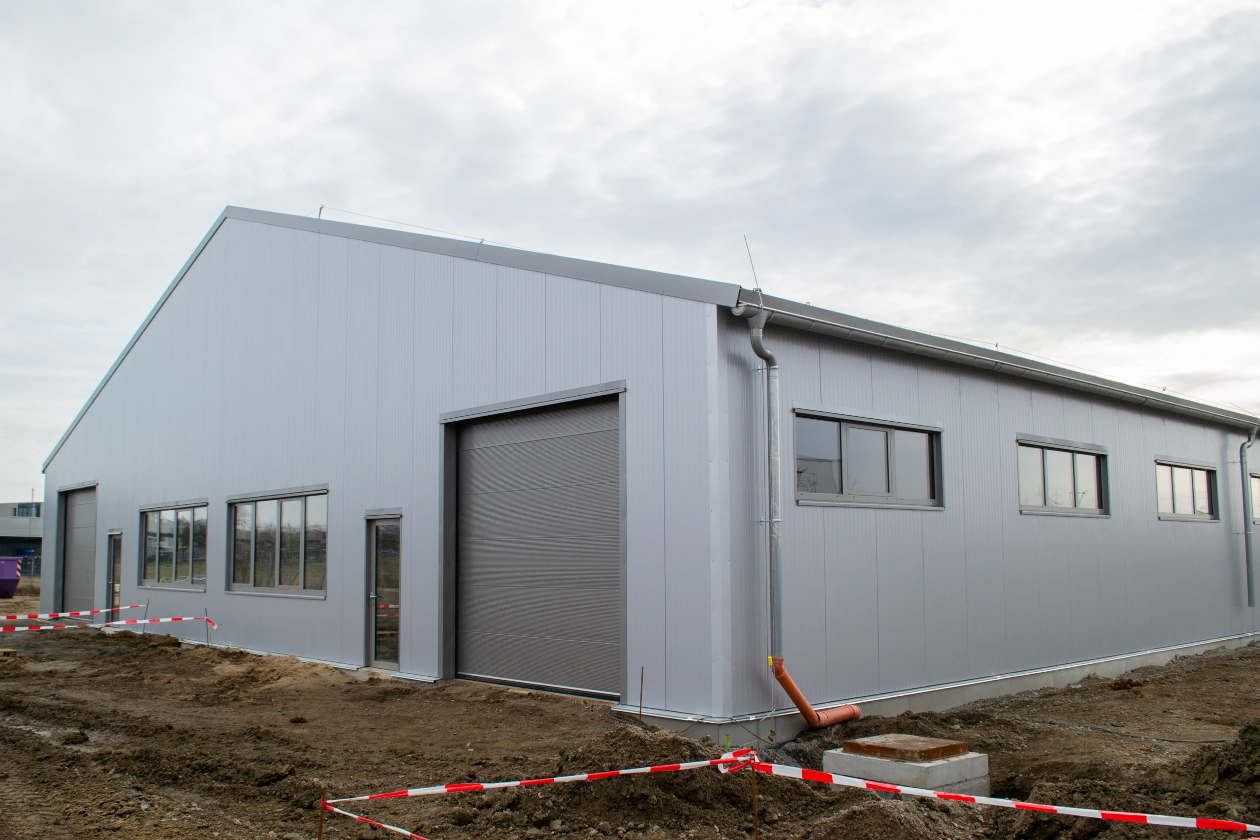 This highly-specified industrial building has two pedestrian doors and four sectional doors, two with wicket pedestrian doors. There are a total of 13 aluminium framed windows, some with skylight openers. Inside the building a partition with double doors in it has been installed along the roof ridge line. The colours of this industrial building were matched perfectly to the customer’s wishes.