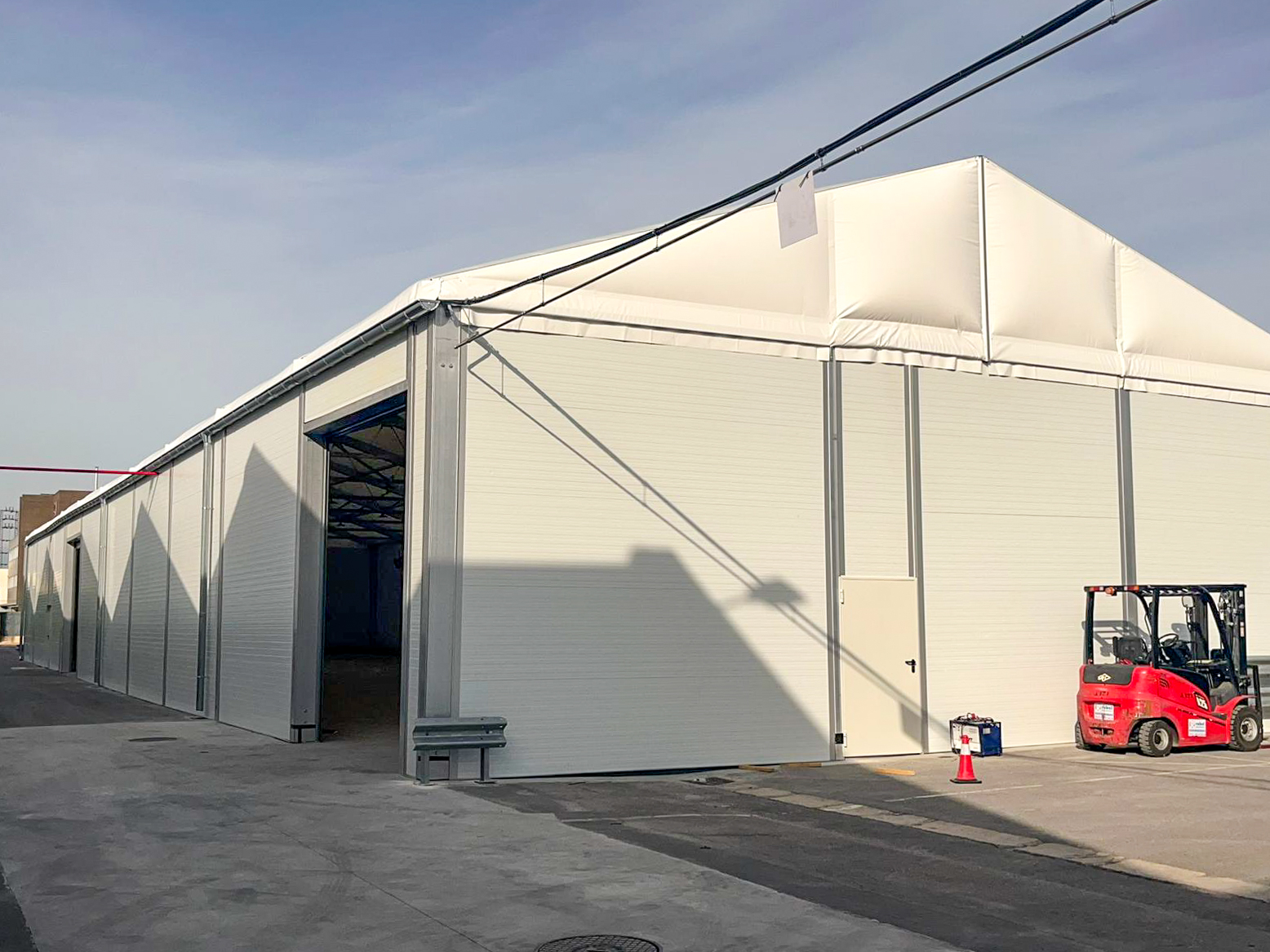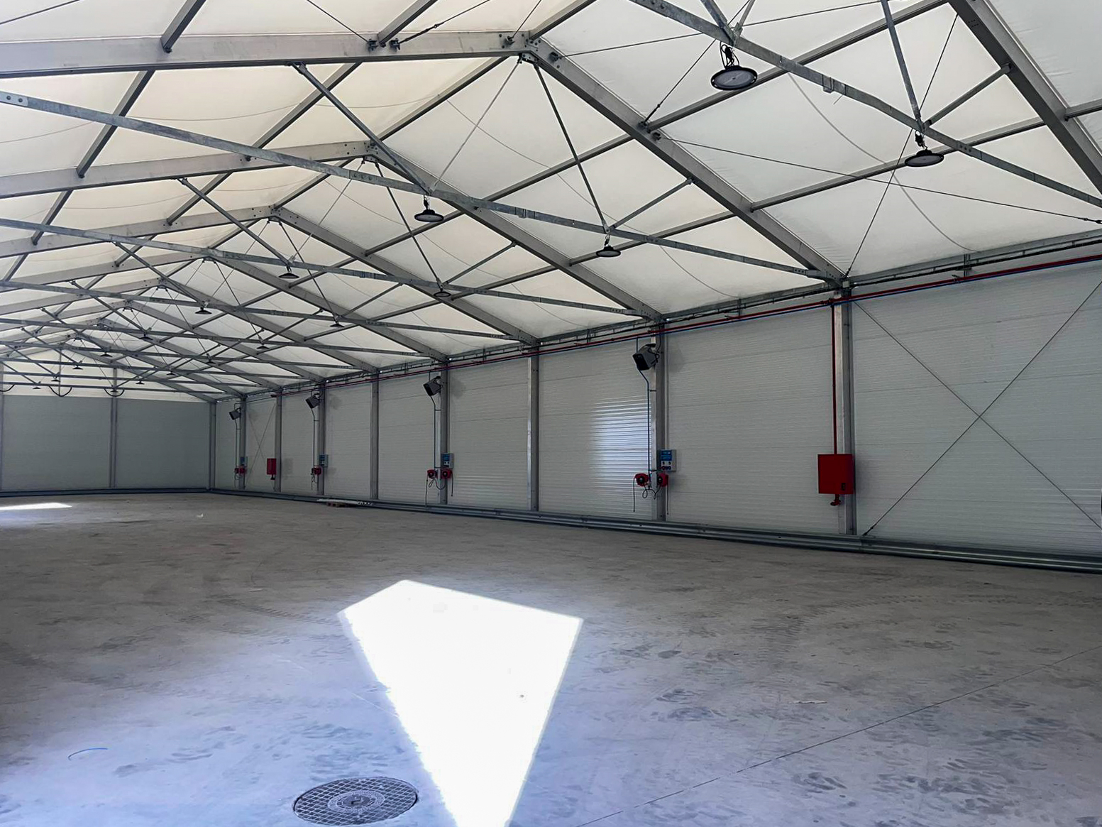 To provide a bright, well-lit interior, a full lighting system was installed. The end result is an industrial temporary building with great strength and good looks.