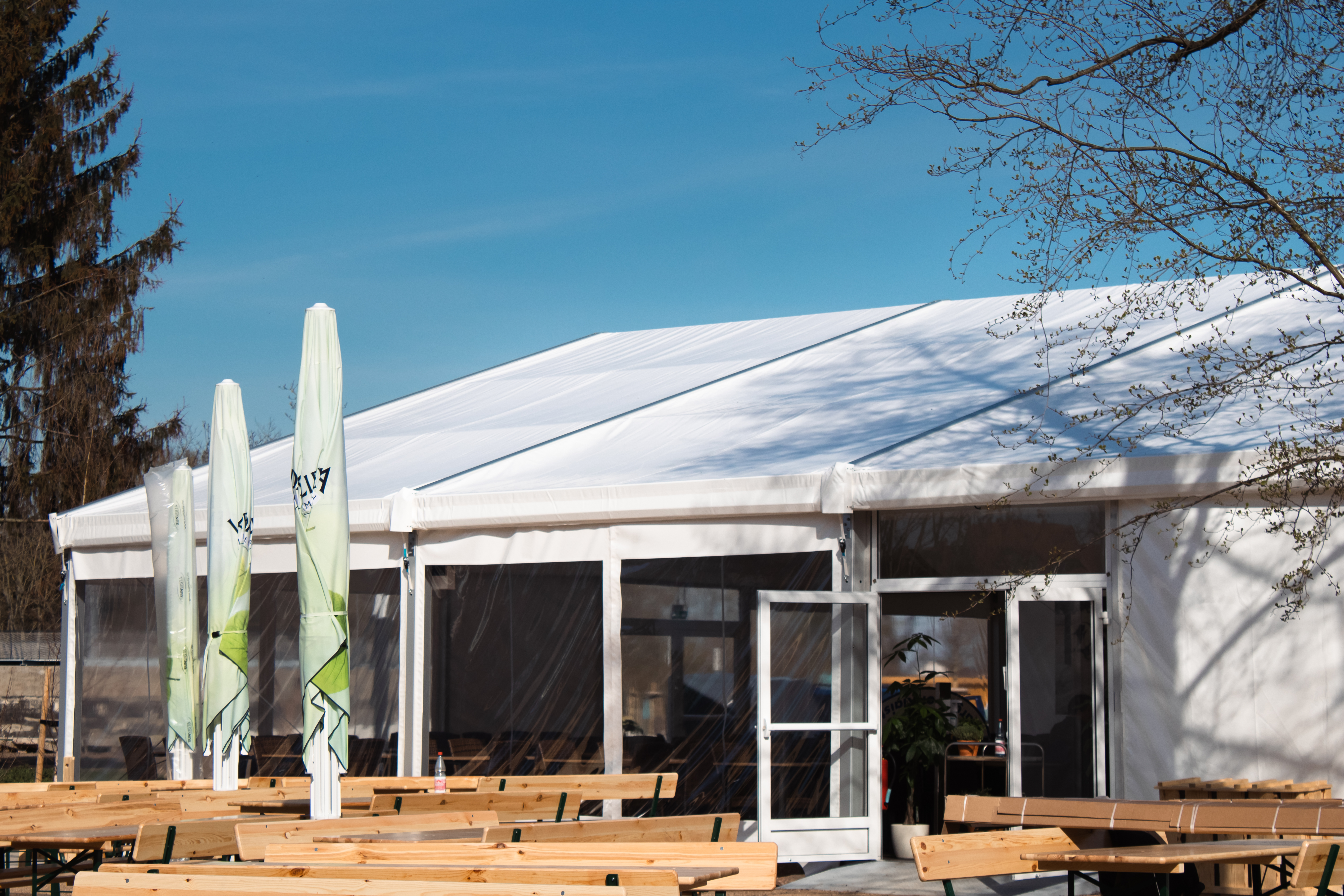 The roof is made from flame-retardant (DIN 4102/B1, M2) PVC and includes four translucent roof sections and gable ends that allow lots of daylight into the marquee.