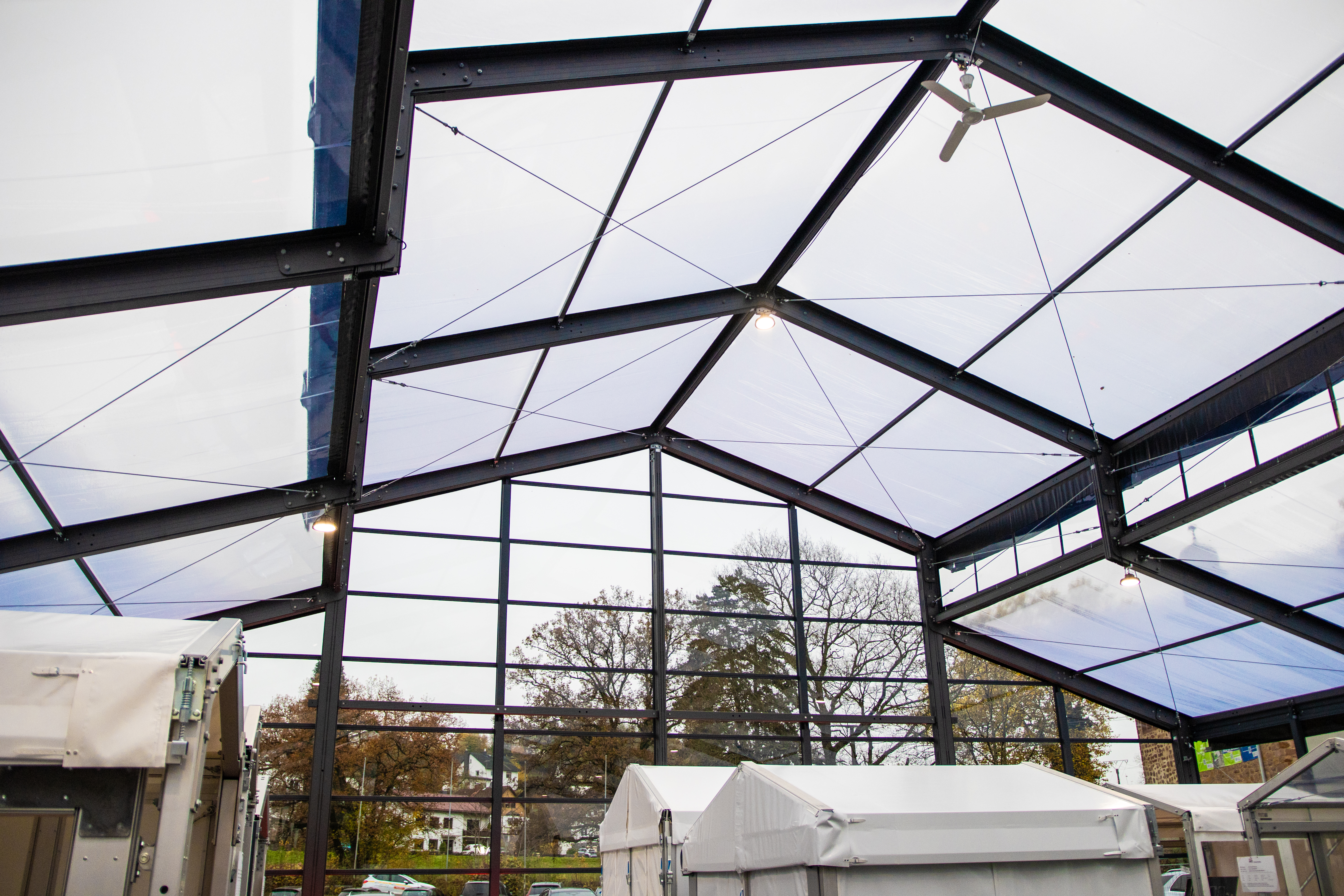 The versatile Orangerie can be fitted with PVC awnings, real glass façades or insulated sandwich panel walls. Ventilation windows in the roof area are also available as an option. The powder-coated tent frame can be customized in the color of your choice and provides a stable base for all interior fittings.