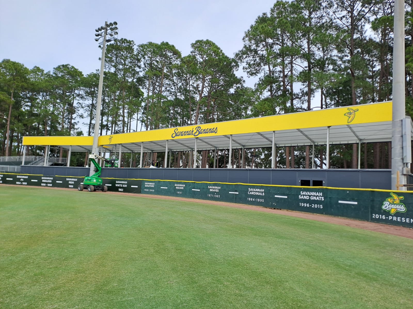 The anodized aluminium frames of both structures are modular and seamlessly connected but allow the seating area to wrap around the curved baseball ground perimeter.