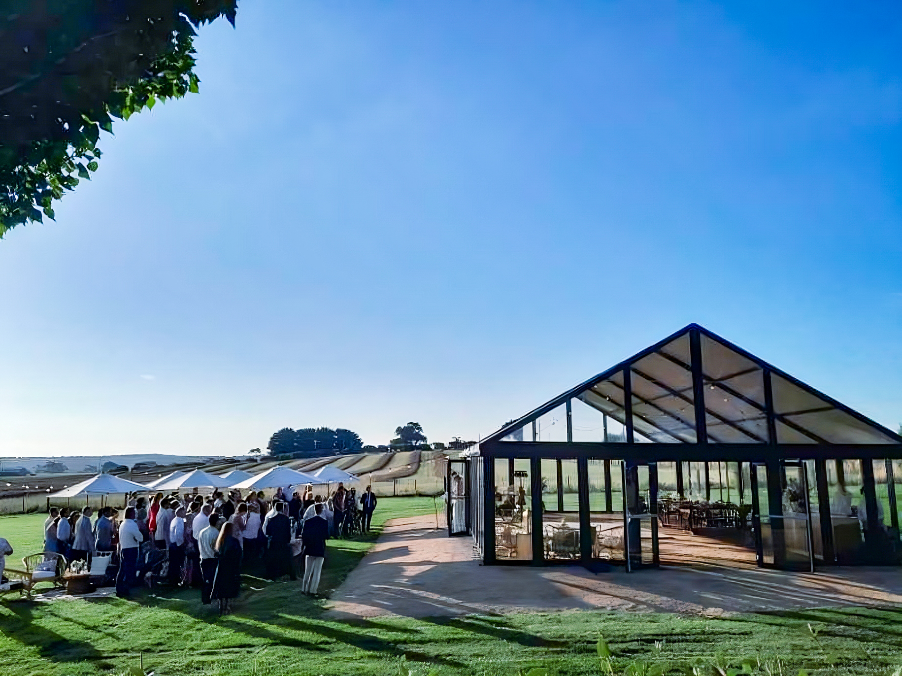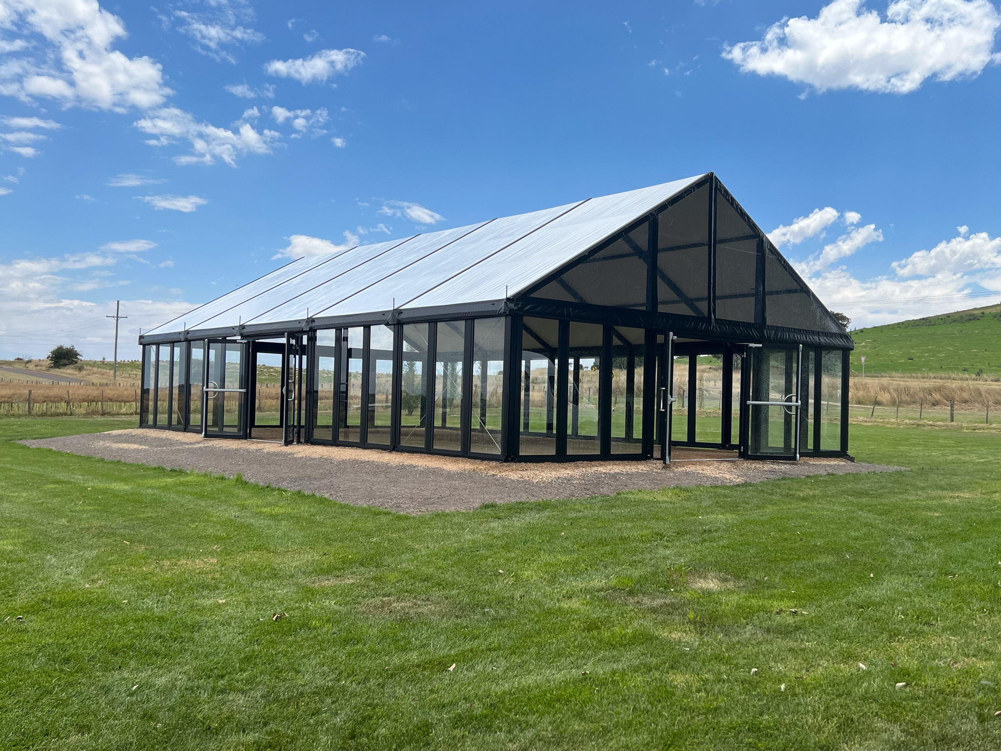 Our Weinheim event marquee with glass façade has been used as a wedding reception venue in Australia. 9m wide and 15m long with 2.4m high walls, this tailor-made tent construction has a modern glass façade, black powder-coated frame and transparent gable panels.
