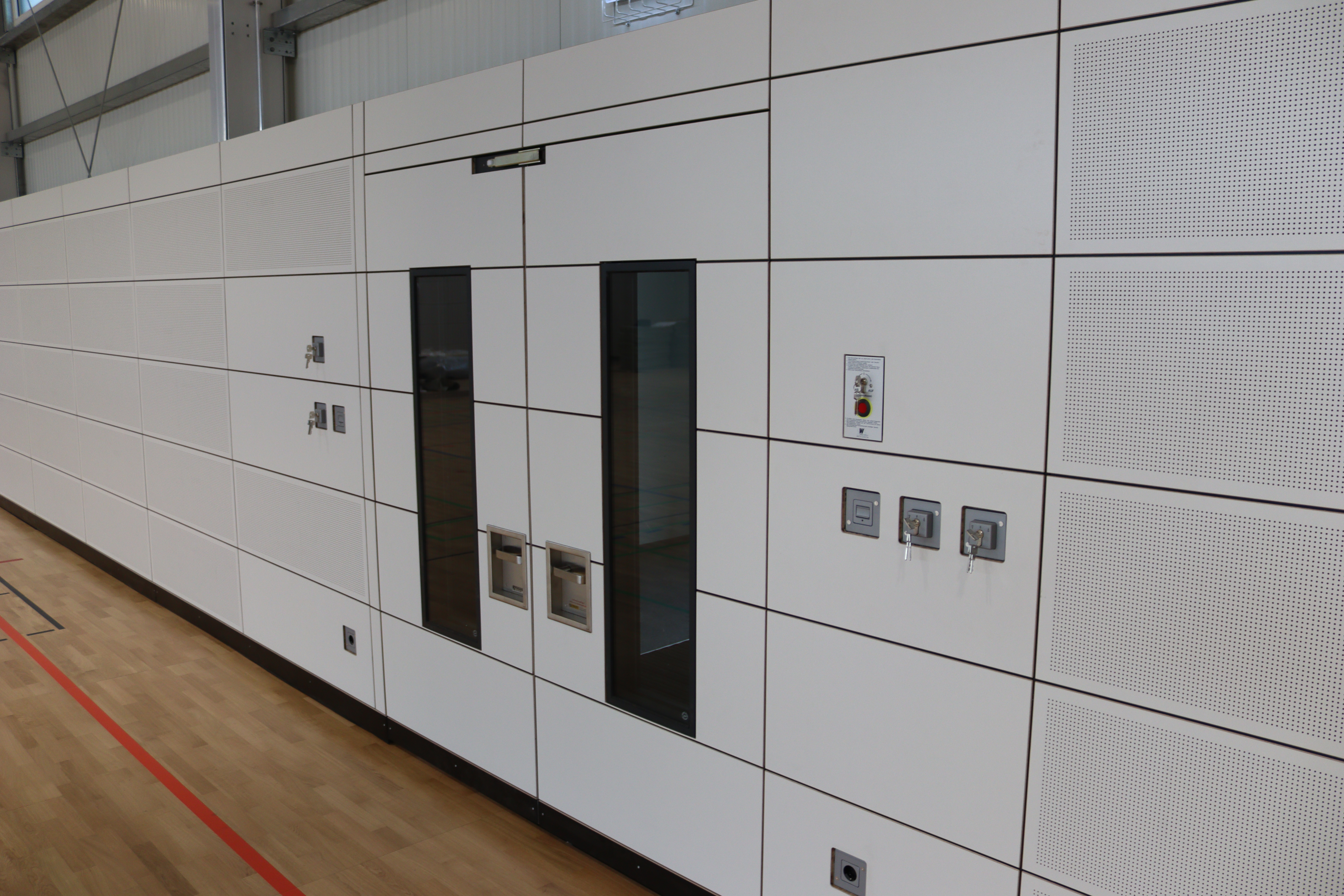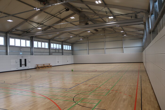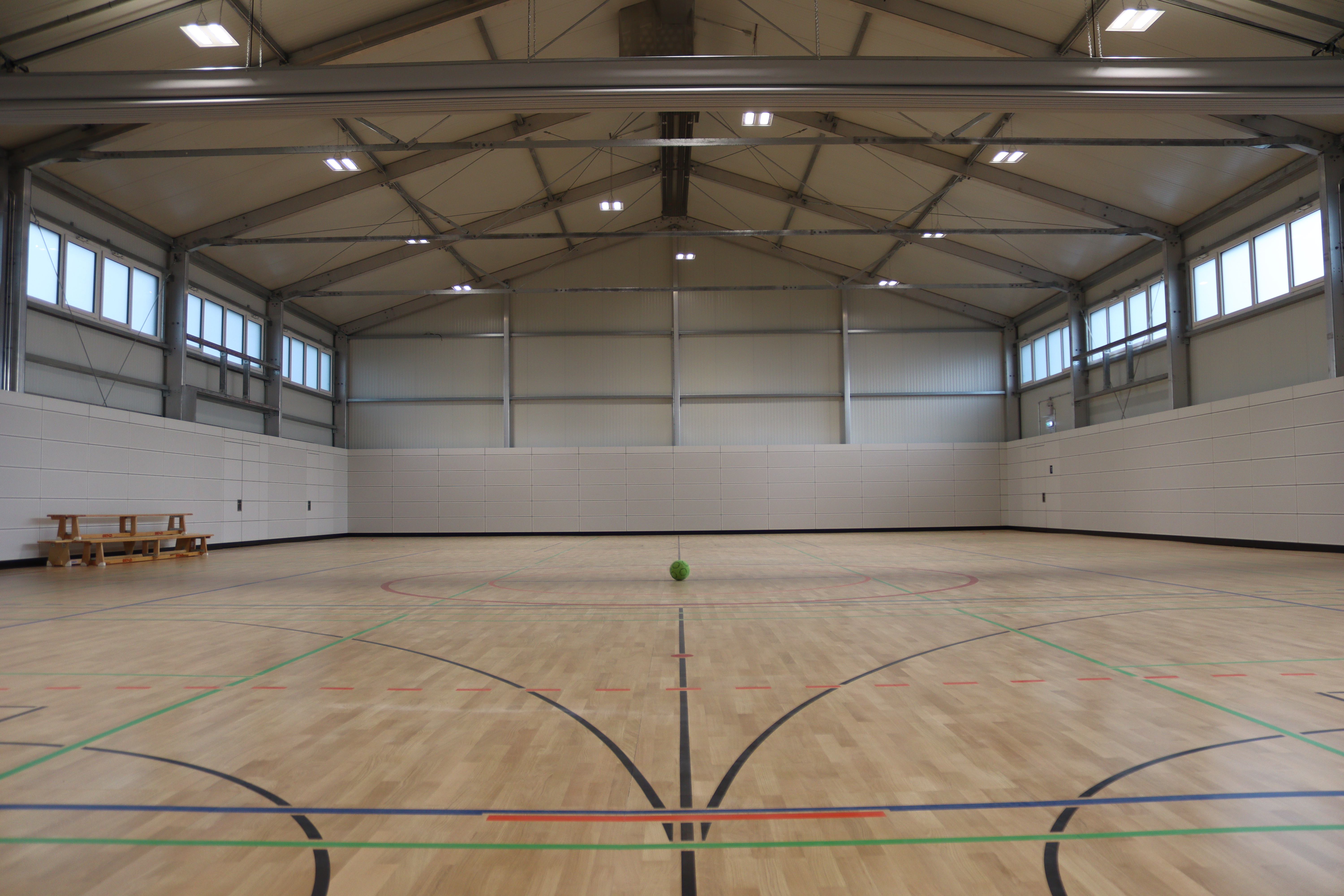As the general contractor for this project, we delivered a completely enclosed sports hall measuring 17m x 35m. The building is insulated with 100mm thick sandwich panels and has mobile sports parquet flooring, impact walls, dark beam heating and modern electrical installation we also installed the building’s alarm system, a synthetic leather partition curtain, and an upstream container facility containing changing rooms and storage space for sports equipment. As part of the contract, we also completed the preparatory work such as planning a reusable foundation and thermal insulation certificates.