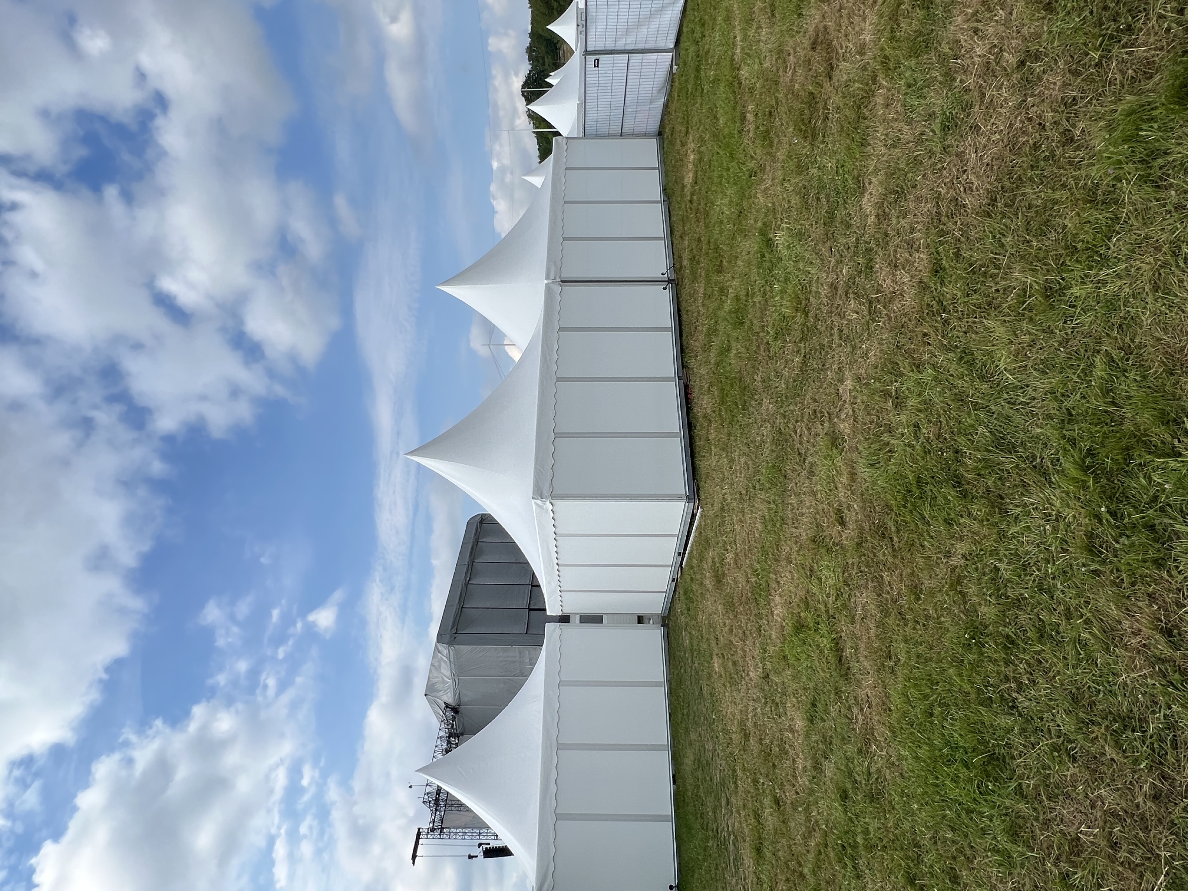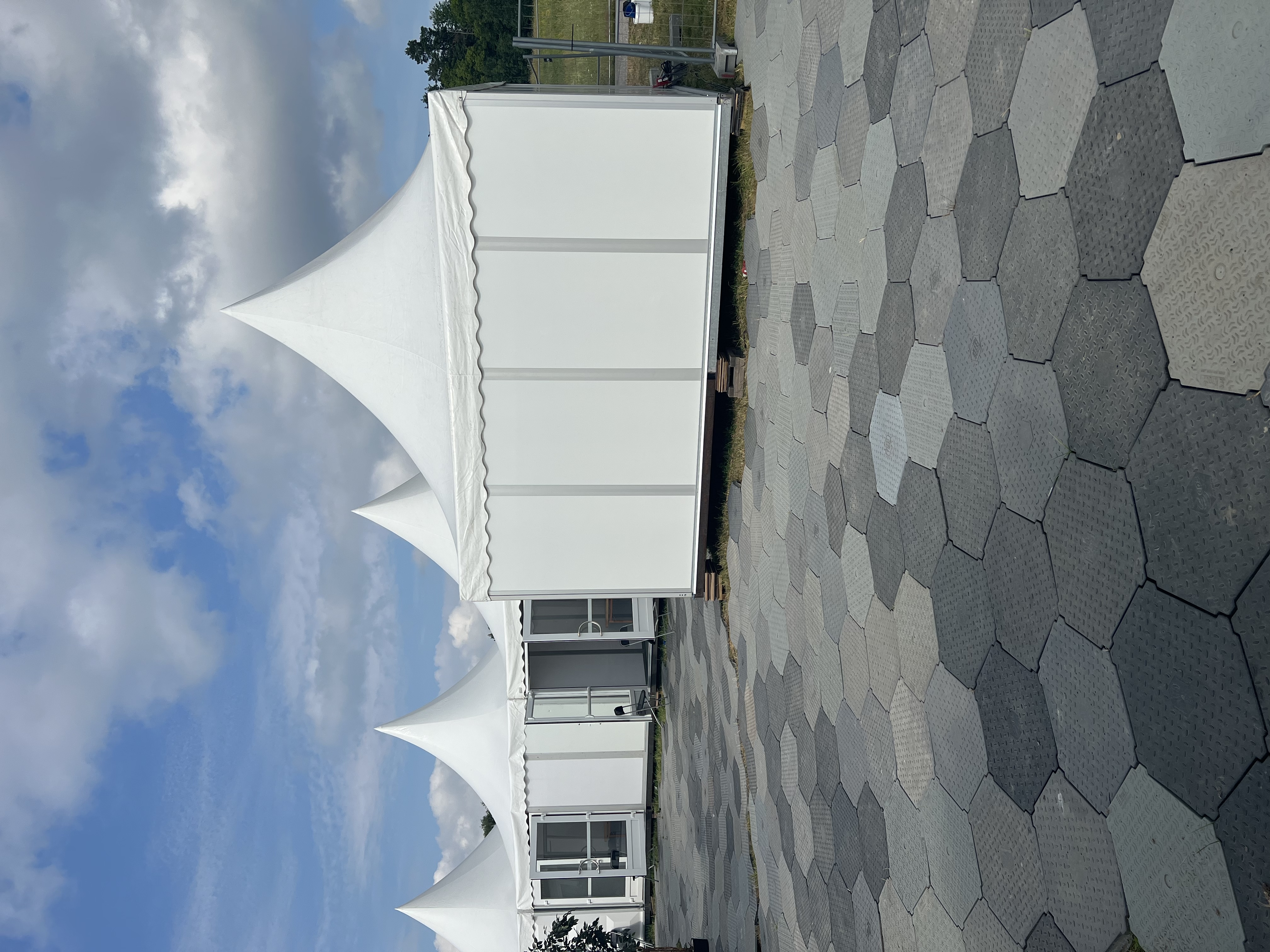 Ten 5 x 5m Metz pagodas with their striking high roofs were supplied for a venue in Sweden. The stylish pagoda tents have translucent PVC roofs and white PVC panel walls. These are supported by anodized aluminium frames fixed to heavy-duty flooring which avoids the need for additional ground anchors. Additional safety and strength are provided by steel eaves and ridge connections.