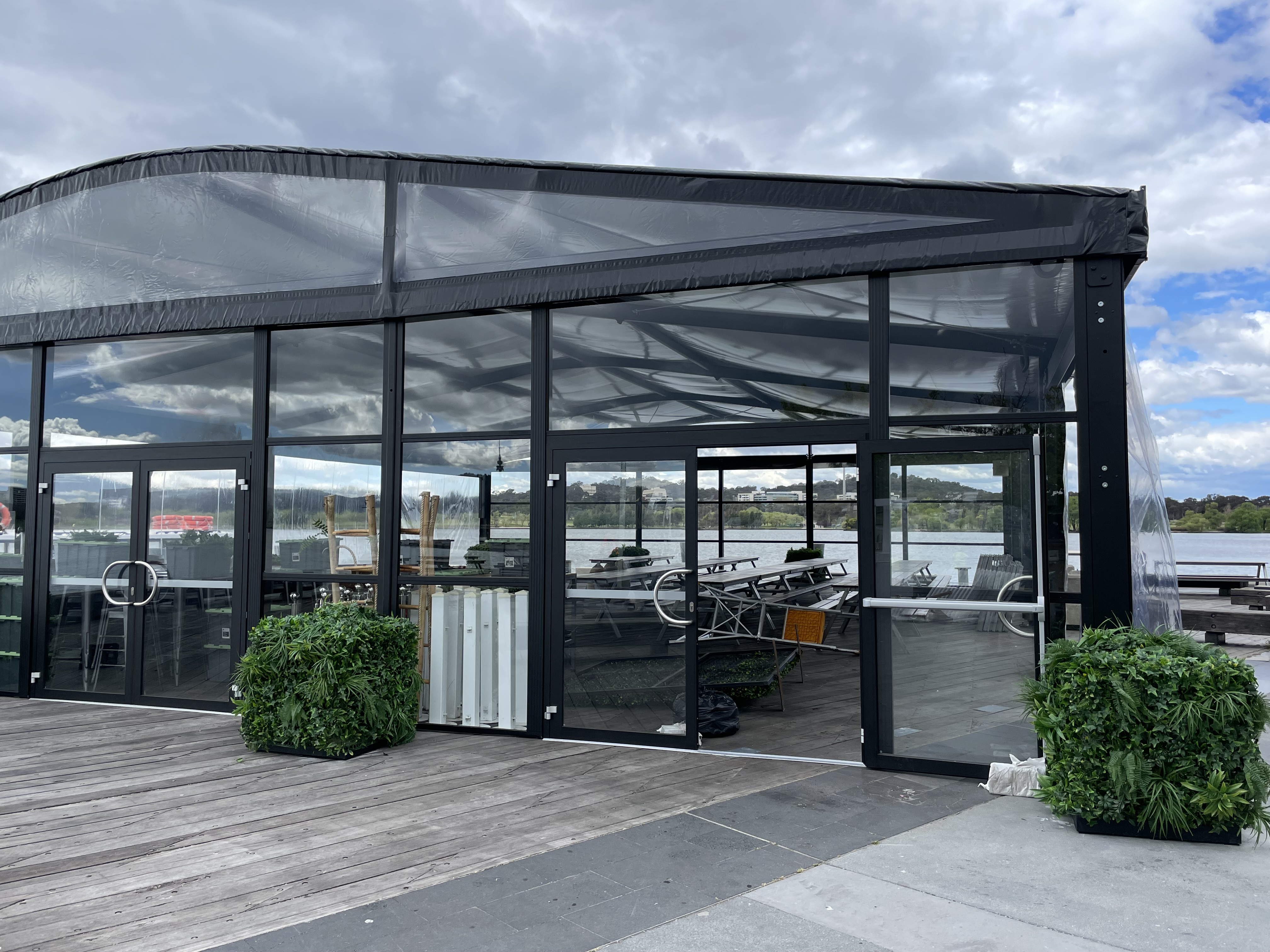 Three sets of wide opening double leaf doors facilitate maximum movement between the inside and outside of the marquee.